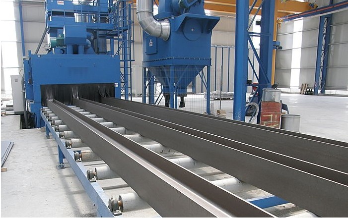 輥道通過式拋丸清理機是將工件吊放在輸送輥道上,輥道輸送系統(tǒng)將工件向前輸送,當(dāng)工件進入清理室時,拋丸器開始順序工作。經(jīng)過拋丸處理后,鋼材表面的氧化皮、污物及其它附著物被清理干凈,處理過的表面可達(dá)Sa2-2.5級。拋丸機的工作方式是連續(xù)循環(huán)進行的。